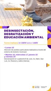 La Municipalidad de la Ciudad de San Juan, a través de la Secretaría de Ambiente y Desarrollo Sustentable, informa el cronograma semanal de desinsectación y desratización que se llevará a cabo en diferentes zonas del departamento.