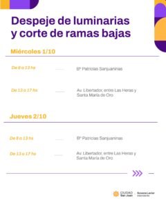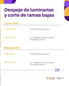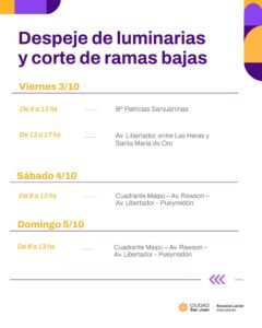 La Municipalidad de la Ciudad de San Juan, a través de la Secretaría de Servicios y Ambiente, informa el cronograma de despeje de luminarias y corte de ramas bajas, con el objetivo de mejorar la iluminación en la vía pública y mantener en condiciones el arbolado urbano.