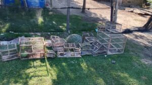 En una vivienda de Villa Etelvina, en Caucete, se secuestraron varias aves autóctonas —entre ellas un lagar rojo, un benteveo, una diuca, un boquense y un loro barranquero— además de 19 jaulas y un transportín. También se incautó un rollo de tela olímpica y dos reflectores denunciados en Comisaría 9.ª.
