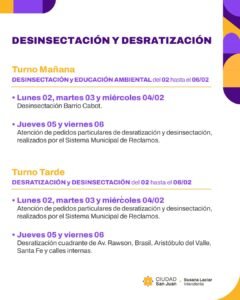 La Municipalidad de la Ciudad de San Juan informa el cronograma de desinsectación, desratización y educación ambiental que se desarrollará del lunes 2 al viernes 6 de febrero, con trabajos organizados en turno mañana y turno tarde, abarcando barrios de la Capital y la atención de reclamos particulares ingresados por el Sistema Municipal de Reclamos.