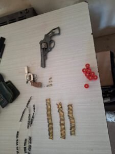 En el primer domicilio, la policía secuestró un arma de fuego tipo revolver calibre 22, 87 cartuchos calibre 22, un arma de fuego tipo revolver calibre 32, un cartucho calibre 32, 8 cartuchos calibre 16, un chaleco tipo táctico policial y 22 plantas de marihuana.