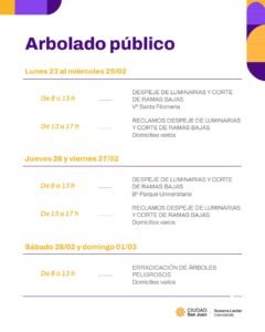 La Municipalidad de la Ciudad de San Juan, a través de sus equipos de Servicios, llevará adelante un nuevo operativo de intervención sobre el arbolado público con el objetivo de mejorar las condiciones de seguridad urbana y optimizar la iluminación en la vía pública.